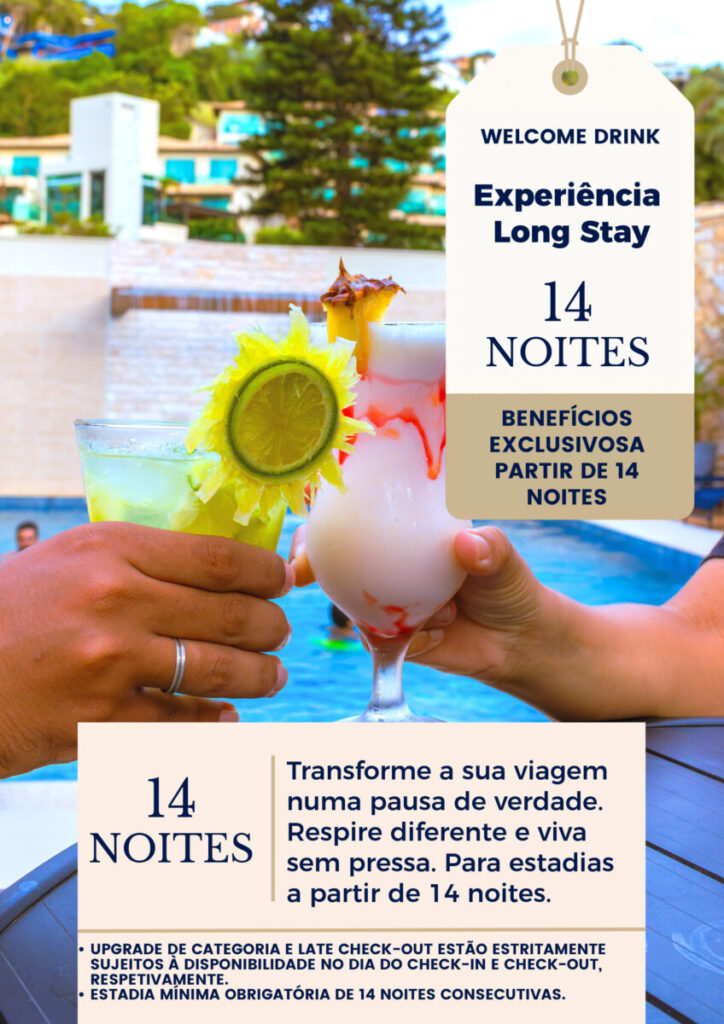 Transforma tu viaje en una verdadera pausa. Respira diferente y vive sin prisas. Para estadías a partir de 14 noches, hemos preparado beneficios exclusivos para que te sientas como en casa, pero con toda la comodidad y el servicio premium que solo Ilha Branca ofrece. Es la oportunidad ideal para quienes desean prolongar su descanso o trabajar con vista al mar.