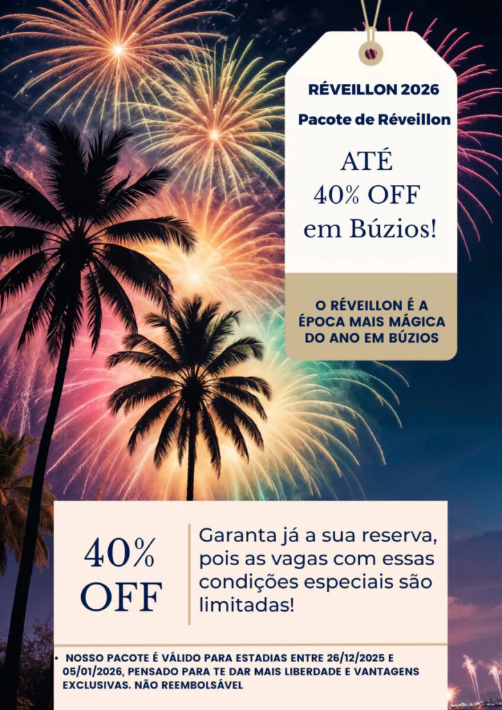 O Réveillon é a data mais procurada em Búzios e nossas vagas com estas condições especiais são limitadas. Garanta sua vaga e comece 2026 no paraíso!